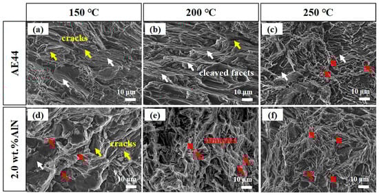 Tensile fracture morphologies of (a–c) AE44 alloy and (d–f) 2.0 wt.% AlN/AE44 composite at high temperatures (150, 200, 250 °C).