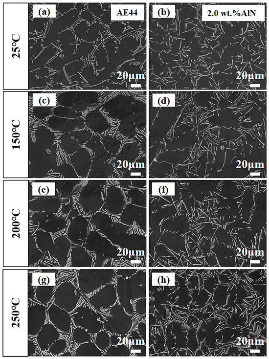 Comparison of the microstructure between (a,c,e,g) AE44 alloy and (b,d,f,h) 2.0 wt.% AlN/AE44 composite after deformation at different temperatures (25, 150, 200, 250 °C).