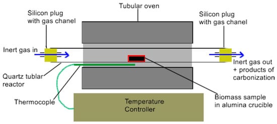 Figure 1 shows the experimental setup for biocarbon preparation via the pyrolysis method. This experimental reactor was built by the authors of this work in accordance with the developed project. The main advantage of this flow reactor is the possibility of producing biocarbon from different organic waste products from biomass under similar conditions as with the DC-SOFC setup. They are then used as fuels in solid oxide fuel cells (DC-SOFCs). The experimental setup followed, as described in [26].