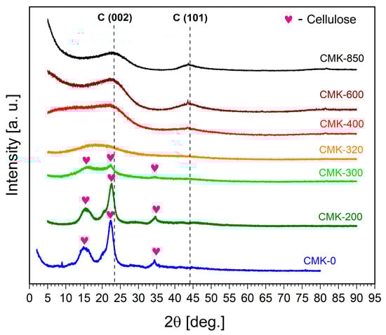 Figure 2 also shows the recorded XRD patterns for biochar samples obtained from microcrystalline cellulose through additional heating in an oxygen-free atmosphere at temperatures ranging from 200 °C to 850 °C. In the CMK-200 sample, cellulose reflex patterns were visible. (110) in the ca. 15–16° position was observed as a broad peak but was composed of two peaks—that is, (200) in the 22.5° position and (004) in the 34° position. Based on this diffraction pattern recorded for the CMK-300 sample, it could be concluded that heating in these conditions led to the formation of two-phase samples composed of the carbon phase and cellulose residues. Increasing the sample heating temperature to 300 °C led to an increase in the degree of conversion of the cellulose phase to the amorphous carbon phase.