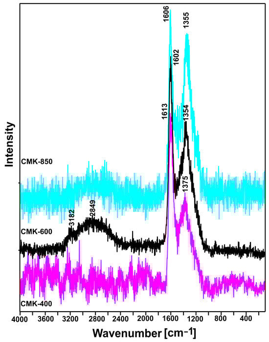 Emerging weak peaks in the C(002) and C(001) regions were also visible, characteristic of graphitic structures. For the CMK-600 sample, no traces of reflex characteristics for biomass were observed, while the previously mentioned graphitic peaks had a better shape and intensity than the CMK-400 sample. Sample CMK-850 was similar to CMK-600, but the graphitic reflexes were slightly more mature. Based on the XRD tests, it was found that solid fuel samples heated at 400–850 °C were monophase carbon materials. These results showed close agreement with the data in [35].