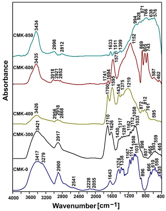 Mid-infrared (MIR) spectroscopy was used to investigate the evolution of the chemical composition of organic compounds during the thermal conversion of cellulosic feedstock. Figure 4 shows the MIR spectra recorded for the starting sample (CMK-0) and biochar samples obtained in the temperature range 300–850 °C (CMK-300 to CMK-850). As the temperature increases to 400 °C, a sharp decrease in the intensity of the band at approximately 3420 and 1640 cm−1 associated with the vibrations of hydroxyl groups is visible, indicating the occurrence of dehydration or dehydrogenation. So, partial cellulose pyrolysis in the 300–400 °C temperature range produced torrefied samples, which characterised a reduction in intensity for the OH absorption group.
