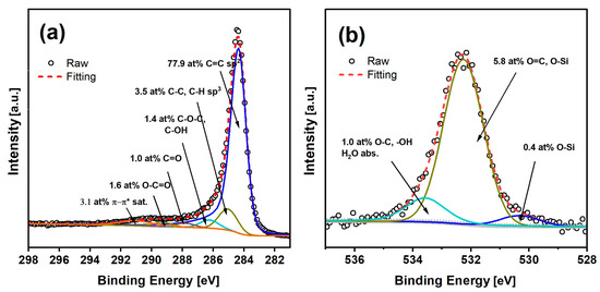 The collected high-resolution spectra for C 1s and O 1s are shown in Figure 6. The C 1s spectrum of the sample was fitted with six components. The first is most localised at a binding energy of 284.4 eV, indicating C=C (sp2) bonds. The maximum related to the second component is visible at 285.1 eV, indicating the presence of C-C (sp3) bonds. The maximum at 286.3 eV corresponding to line 3 shows the presence of C-O-C and/or C-OH groups. Line 4 of the maximum appears at 287.8 eV, indicating the presence of C=O groups. Line 5 has a peak localised at 287.8 eV, showing the presence of O-C-O bonds, while the last line of maximum at 291.0 eV is attributed to π->π* shake-ups. The shake-up excitation originates from the sp2 carbon and its aromatic forms and is an additional parameter confirming the presence of this type of bond. The O 1s spectrum was fitted with three lines, with the first line cantered at 530.7 eV, which indicates the presence of O-Si bonds; the second line of maximum at 532.4 eV coming from either O-Si and/or O=C type groups; and the last line of maximum found at 533.8 eV, which can originate from O-H and/or O-C type bonds and/or adsorbed H2O.