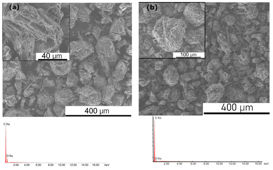 As seen in Figure 7a,b, in the case of the pure cellulose used as feedstock, the particles ranged from ~5 μm to 150 μm. For the partially carbonised sample CMK-300, solid carbon particles with regular and irregular shapes were observed. Their particle size varied from ~7 μm to ~240 μm. EDS analysis of the carbon particles’ chemical composition indicated that the CMK-300 sample was characterised by high purity. The measured signals from carbon or oxygen are marked on the spectrum.