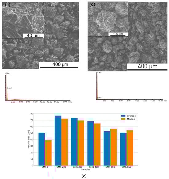The recorded SEM images illustrated that with an increase in temperature for monophase biocarbon samples CMK-600 or CMK-850, the average particle size of carbon particles decreases with increasing temperature. Figure 7c provides the SEM image of the carbon particles. In the case of CMK-600, the particle size ranged from ~7 μm to ~140 μm. CMK-850, the biochar synthesised at the highest temperature, was characterised by a lower carbon size particle range from ~5 μm to ~111 μm. Figure 7e shows the collective results of the particle-size distribution analysis for the investigated sample family: CMK-0 as the pure cellulose sample, the two-phase torrefied samples CMK-200 and CMK-350, and the single-phase biochar samples CMK-400, CMK-600, and CMK-850.