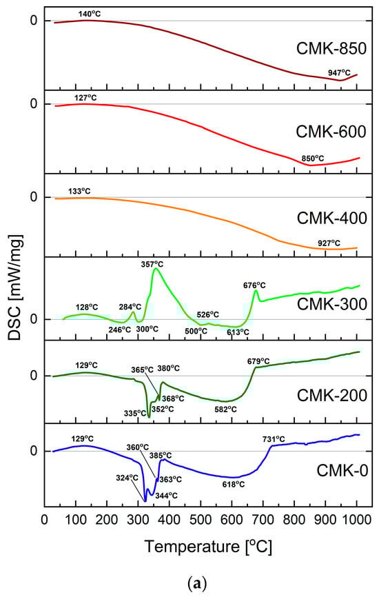 Figure 8a shows the differential scanning calorimetry (DSC) curves of the raw cellulose CMK-0 and the carbonised samples from the entire CMK series, from 200 to 850.