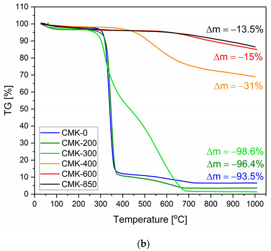 By contrast, for the cellulose samples subjected to pyrolysis at temperatures of 400–850 °C, the observed mass losses were much lower. The loss was ~30% for the CMK-400 sample, while such changes were between ~13% and ~16% for the CMK-600 and CMK-850 samples, respectively.