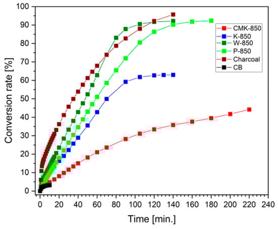 In Figure 9, the conversion rate of biochar sample CMK-850 to the gaseous phase using steam as a medium for gasification is presented. This figure includes data from biochar synthesised at 850 °C from organic waste materials such as coconut shells (K-850), pistachio shells (P-850), walnut shells (W-850), and other carbonaceous materials, including carbon black (CB). Activated charcoal is added for comparison.