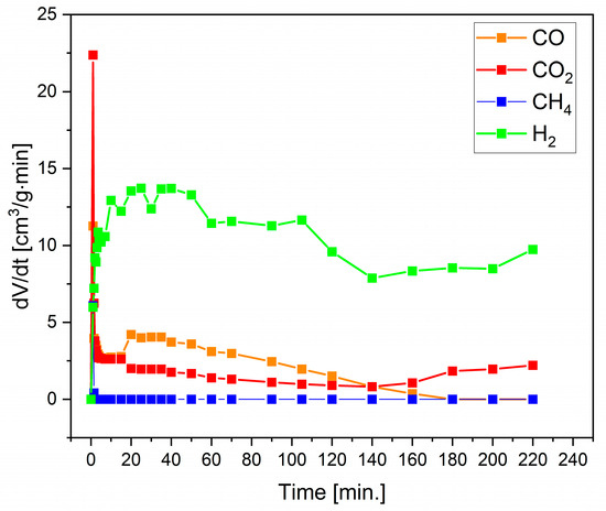 where V equals the volume flow of the reaction gas in cm3/min, and ci(t) equals the concentration of a given product in the post-reaction gas at time (t) in the percentage of volume. The apparatus and the study of coal and biomass gasification are described in [28,29].