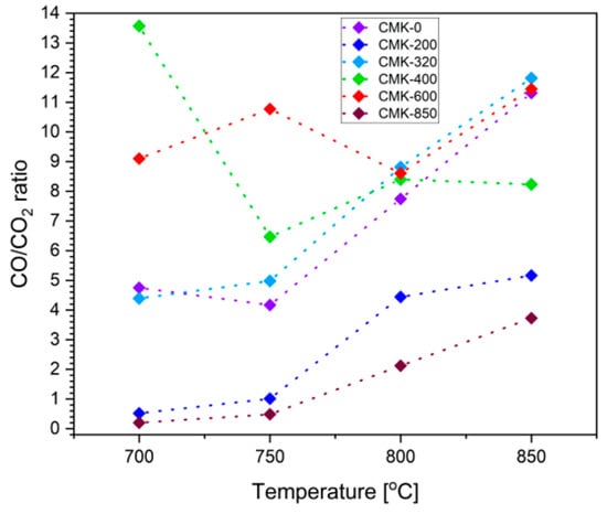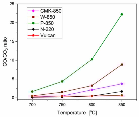 Further thermal heating of CMK-200 and CMK-300 samples, which have previously undergone thermal conversion, leads to further thermal decomposition processes with the release of, e.g., oxygen. In turn, the presence of oxygen leads to further conversion processes as a result of further pyrolysis or gasification of biocarbons to the gaseous forms CO and CO2. The direct consequence of these phenomena is the formation and release of more and more gaseous products as the temperature increases.