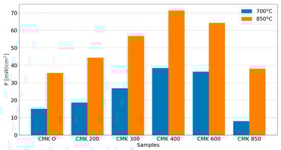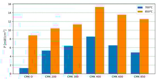 Biochar samples obtained from microcrystalline cellulose are characterised by a lack of mineral substances but have a high content of gaseous products originating from the decomposition of individual cellulose fractions. Figure 18 presents the electrochemical P at 700 °C and 850 °C of a DC-SOFC (B) powered by solid fuels from the CMK series. The highest P was obtained for the DC-SOFC supplied by the CMK-400 biochar. Increasing the thermal treatment temperature of the biochar from 600 °C to 850 °C led to a decrease in the P of the DC-SOFC (B).