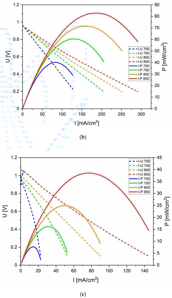 Comparing Figure 17b,c shows that lower I and P were attained from the DC-SOFC (B) supplied by biochar carbonised at 850 °C compared to the biocarbon fuels obtained in the temperature range of 200 °C to 850 °C. One of the reasons for the deterioration of the operating parameters of the cell may have been the increase in the degree of graphitization of carbon particles in the CMK-850 biochar in relation to the biochar samples synthesised at a lower temperature.