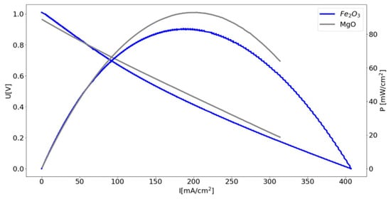 Dependence of voltage–current density (U–I) and power–current density (P–I) of DC-SOFC (A) supplied by cellulose sample CMK-850 +5% wt. Fe2O3 or CMK-600 +5% wt. MgO. As seen in Figure 19, adding a Fe2O3 or MgO catalyst to the biochar increased the operating parameters of the DC-SOFC compared to the DC-SOFC powered by carbon fuel only without the catalyst (Figure 17c). The improved biochar activity in the reverse Boudouard reaction was necessary to enhance the electrical P of the DC-SOFC (B) [67].
