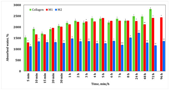 Each biomaterial was obtained in parallel, in three copies, and each material was further tested. The resulting graphs (water absorption and enzymatic degradation) were made considering the arithmetic mean of the measurements obtained for each specimen, with the corresponding standard error. The data obtained were then statistically analyzed with the Graph Pad Prism 5 program, in which the values were compared with the negative control, considered in this case to be the collagen membrane, for both water absorption and enzymatic degradation studies. The statistical significance of the obtained results was determined according to the value of the parameter “p” generated by the statistical program, which is represented on the graph according to its value, by means of *, **, or *** notations.