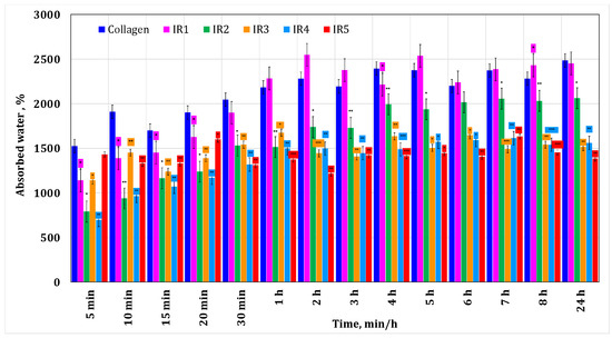 Water absorption for the collagen-based membranes with different irinotecan concentrations. A p-value > 0.5 indicates that the results obtained are not statistically significant. “*” corresponds to results with statistical significance (0.5 < p < 0.1), “**” corresponds to distinctly statistically significant results (0.1 ≤ p < 0.01), and “***” corresponds to highly statistically significant results (p ≤ 0.01).