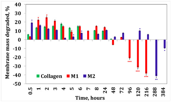 Collagenase degradation of collagen membranes with minocycline. A p-value > 0.5 indicates that the results obtained are not statistically significant. “*” corresponds to results with statistical significance (0.5 < p < 0.1), “**” corresponds to distinctly statistically significant results (0.1 ≤ p < 0.01), and “***” corresponds to highly statistically significant results (p ≤ 0.01).