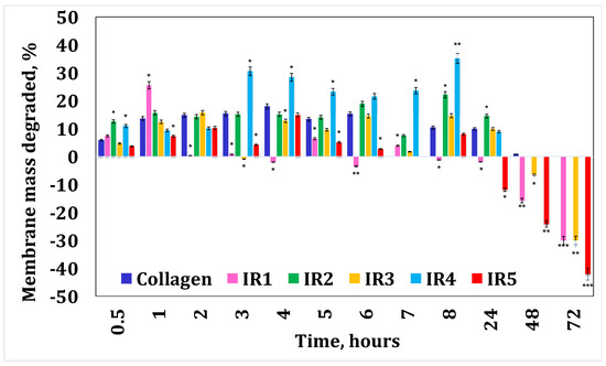 Collagenase degradation of the collagen membranes with irinotecan. A p-value > 0.5 indicates that the results obtained are not statistically significant. “*” corresponds to results with statistical significance (0.5 < p < 0.1), “**” corresponds to distinctly statistically significant results (0.1 ≤ p < 0.01), and “***” corresponds to highly statistically significant results (p ≤ 0.01).