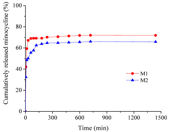 Drug release is investigated through the influence of drug concentration on kinetic profiles. As can be seen from Figure 7, minocycline samples show similar profiles with an obvious burst release effect in the first 15 min (48.57% for M2 and 59.35 for M1), beneficial for ensuring an aseptic environment in the immediate postoperative period, followed by a sustained drug release for up to 24 h to prevent further bacterial invasion or multiplication [32,50]. The cumulative amount of minocycline released (%) over 24 h was 71.95% for the low drug concentration sample M1 and 65.81% for the high drug concentration sample M2.