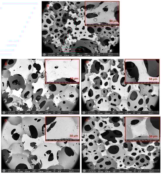 SEM imaging. (A) PUR, (B) PUR-HPAL-CDP, (C) PUR-HPAL-TCPP, (D) PUR-HPCA-CDP, (E) PUR-HPCA-TCPP.