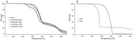 Thermal curves: (A) PUR, PUR-HPCA-CDP, PUR-HPAL-CDP, PUR-HPAL-TCPP, PUR-HPCA-TCPP; (B) organophosphorus fillers TCPP and CDP.