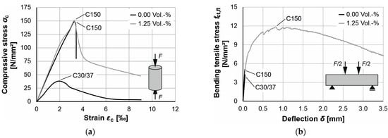 (a) Influence of steel fibers on the material behavior of UHPC under compressive stress; (b) Influence of steel fibers on the material behavior of UHPC under bending tensile stress [19].