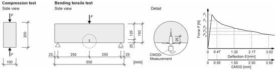 Compression test according to [106,107] (left) and three-point bending tensile test with typical load–deflection or load–CMOD diagram according to [105] (right).