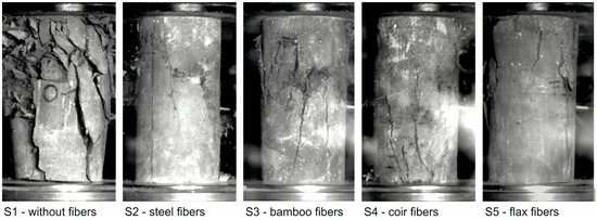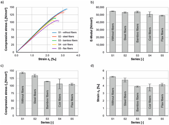 It can be seen that the addition of fibers has a negative effect on the stiffness of the UHPC (Figure 7b), with the reduction depending on the fiber type ranging from very low ≈ 2–3% (for steel and bamboo fibers) to approx. 10% (for coir and flax fibers). In contrast, the compressive stresses (Figure 7c) and the associated strains (Figure 7d) show greater differences between the unreinforced and fiber-reinforced cylinders. While the cylinders reinforced with steel fibers show reductions of 6.6% in the maximum compressive stresses and 8.4% in the associated strains, these are significantly higher for the cylinders reinforced with natural plant fibers, namely between 20% and 26.4% in the compressive stresses and between 20.2% and 27.4% in the associated strains.