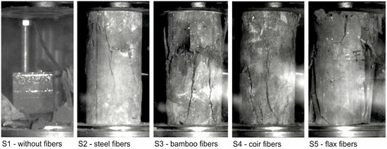When testing the cylinders without fiber reinforcement, a sudden and brittle failure occurred as expected, while in all cylinder tests with fiber reinforcement—both with steel and natural plant fibers—ductile rather than sudden failure occurred. The photos of the test specimens at the time of initial cracking are shown in Figure 4 (cracks are marked with a red circle), at the time of failure are shown in Figure 5, and after the test in Figure 6 (images from a high-speed camera).