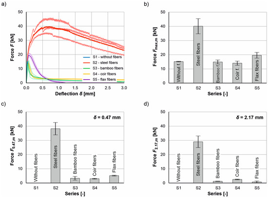 Results of the bending tensile tests: (a) force-deflection diagram and comparison of the (b) maximum loads, (c) loads at a deflection of 0.47 mm (CMOD1), and (d) loads at a deflection of 2.17 mm (CMOD3) of series S1 to S5.