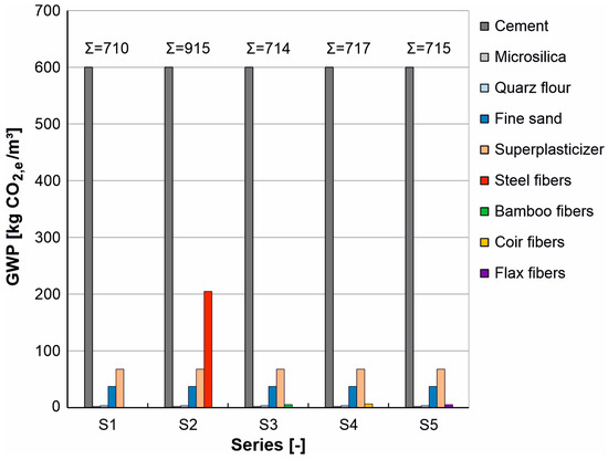 The evaluation shows that the GWP of the cement accounts for the largest proportion of all UHPC mixtures considered (Figure 10, gray bars). Since the UHPC mixtures considered here differ only in the fibers (see Table 3), this proportion is identical for S1 to S5 (this also applies to the other components, with the exception of the fibers). Corresponding measures to reduce the GWP share of the cement, e.g., by using secondary cement substitutes, were not considered further in this article. The steel fibers have the second largest GWP share (see Figure 10, red bar at S2), which, even with a comparatively low fiber content of 1.25% by volume, have a considerable share in the CO2 balance and account for around 22% of the total GWP of the S2 series. This confirms the above-mentioned investigations according to [1,3,9,53]. In addition to the cement, the micro-steel fibers in particular have very high GWP values and have a negative impact on the life cycle assessment. In comparison, the GWP share of the bamboo fibers (Figure 10, green bar at S3), the coir fibers (Figure 10, yellow bar at S4), and the flax fibers (Figure 10, purple bar at S5) is only about 1% of the respective total GWP of the series S3, S4 and S5, so that the total GWP of the series with natural plant fibers (S3, S4 and S5) hardly differs from the total GWP of the UHPC without fibers. In relation to the GWP share of the steel fibers, the GWP share of the natural plant fibers is only around 2 to 3%.