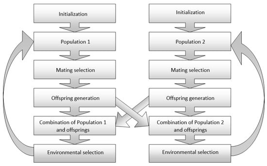 Geng et al. [47] employed a dual-population-based evolutionary algorithm designed to handle constrained many-objective problems, known as DP-NSGA-III. Compared to existing Constrained Many-Objective Evolutionary Algorithms (CMaOEAs) [48], DP-NSGA-III evolves through the exchange of offspring between two populations. The primary obstacle in dealing with Constrained Many-Objective Optimization Problems (CMaOPs) lies in finding a balance between feasible and infeasible solutions. An ε-constraint handling approach was devised with NSGA-III, aiming to leverage the strengths of excellent infeasible solutions within the primary population. The method is graphically presented in Figure 2. The authors demonstrated the effectiveness of the suggested algorithm in efficiently resolving CMaOPs.
