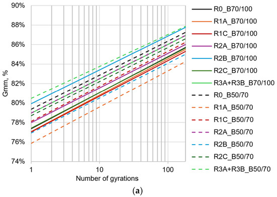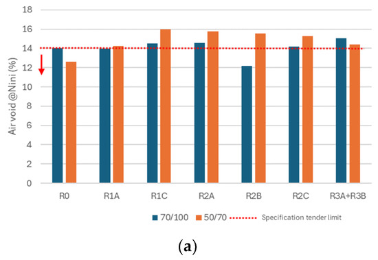 Looking at the air void content at Nini of the mixtures containing the neat bitumen 70/100 (see Figure 7a), there was no substantial difference with the air voids of R0_70/100, except for the mixture containing the R2B additive, whose air void content was 13% lower than that of R0_B70/100.