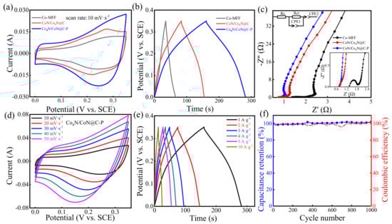 Electrochemical performance of Co-MFF, CoN/Co4N@C, and Co4N/CoN@C-P electrodes in 6 M KOH electrolyte with a three-electrode system. (a) CV curves at 10 mV·s−1; (b) GCD curves at 1 A·g−1; (c) EIS curves; (d) CV profiles of Co4N/CoN@C-P at different scan rates; (e) GCD curves of Co4N/CoN@C-P at different current densities; (f) Capacitance retention and coulombic efficiency of the Co4N/CoN@C-P over 1000 cycles at 1 A·g−1.