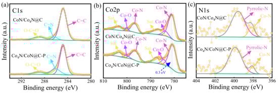 XPS spectra of (a) C1s, (b) Co2p, and (c) N1s for CoN/Co4N@C and Co4N/CoN@C-P.