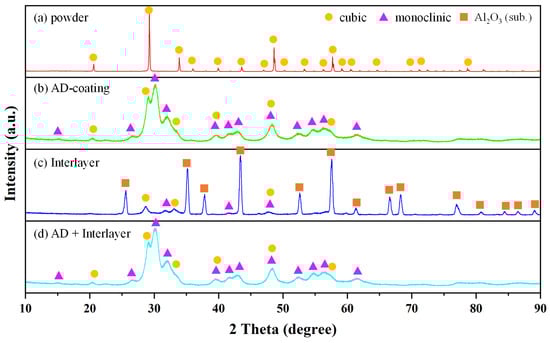 XRD patterns of (a) powder, (b) AD coating, (c) interlayer, and (d) AD coating with interlayer.