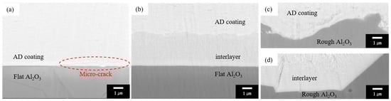 Cross-sectional SEM micrographs of the coating layers after ion milling: (a) AD coating, (b) AD coating with interlayer, (c) AD coating on rough Al2O3, and (d) AD coating with interlayer on rough Al2O3.