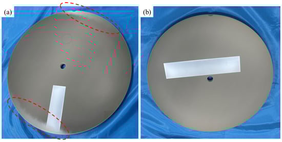 Table 1 details the flatness of the AD coating, interlayer, and AD coating with an interlayer on a 4-inch sapphire wafer; this was measured using a coordinate-measuring machine. Bare sapphire wafers were also measured to identify the variation in the flatness of the AD coating, interlayer, and AD coating with the interlayer. The flatness of the AD coating increased significantly from 12.8 ± 1.5 µm to 228.5 ± 4.4 µm; in addition, it exhibited a convex shape. This significant variation in flatness was caused by the impact energy exerted on the sapphire wafer during aerosol deposition, with a velocity of a few hundred meters per second. On the other hand, the flatness of the interlayer that was created using the physical vapor deposition method slightly increased from 11.2 ± 1.4 µm to 18.2 ± 2.2 µm. In addition, the change in the flatness of the AD coating with an interlayer was less pronounced than that of the AD coating without an interlayer, increasing from 11.6 ± 1.2 µm to 154.6 ± 3.9 µm. The presence of an interlayer significantly enhanced the flatness of the AD coating by approximately one-third. This result can be attributed to the cushioning effect [30], which decreases the kinetic energy of crushed particles during AD processing; this is because the hardness of the interlayer is lower than that of the Al2O3 substrate. The bent products with convex shapes were adversely affected by the following processes: polishing, which was performed to reduce the roughness of the coating surface. Figure 3a,b show the products formed using the AD coating and AD coating with an interlayer, which is a component of the semiconductor equipment chamber; this is following the polishing procedure that was performed to reduce the roughness of the coated surface. Due to the high flatness and convex shape of the coated product, the surface roughness of the AD coating was uneven when the AD coating was turned upside down and polished; this is highlighted by the dotted circle in Figure 3a. When the product has a convex shape, there will be a height difference between the edge and the center regions. Therefore, when the product is turned over and polished, the center coating surface comes into contact with the polishing pad, but the edge coating surface remains at a distance from the polishing pad; this results in an uneven surface. However, the AD coating with an interlayer is polished uniformly throughout the entire product because there is less variation in the flatness of the interlayer; this is shown in Figure 3b.