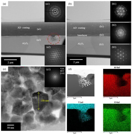 Cross-sectional TEM BF images of (a) AD coating and (b) AD coating with interlayer with inset (a1,a2,b1–b3) SAED patterns; (c) high-resolution TEM image of AD coating layer with inset (c1) FFT pattern; (d) STEM image corresponding to the red-dotted circle region in (a) with EDS elemental maps.