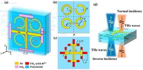 The electromagnetic responses of the device are effectively investigated by CST Microwave Studio. Unit cell boundary conditions are applied in the x and y directions, while an open boundary is set in the z direction. Gold is modeled as a lossy metal, and its conductivity is [25]. The loss equation of polyimide films can be described as . The dielectric permittivity of VO2 in the terahertz range can be characterized by the Drude model [28,29], expressed as , where is dielectric permittivity at the infinite frequency. Collision frequency is set to the plasma frequency, which depends on , can be approximated by , with and [28]. In our simulation, both doped and undoped VO2 is modeled as a material presenting a conductivity of 200 S/m in the insulating state, while in the metallic state, the conductivity is modeled as