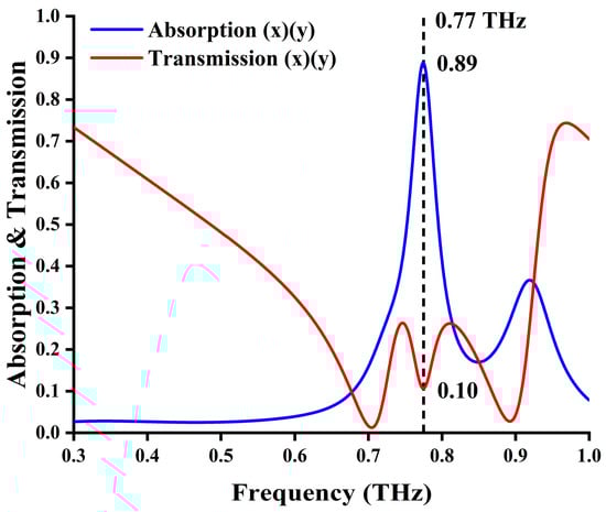 When the temperature is near room temperature (i.e., not exceeding 42 °C (315 K)), both doped and undoped VO2 is in an insulated state (200 S/m for both). In this condition, the device exhibits significant electromagnetic wave absorption characteristics, as shown in Figure 2. The absorption rate A of the device can be calculated using where, , , and are the reflectance, transmittance, reflection coefficient, and transmission coefficient, respectively. The reflectance and transmission for forward (inverse) incidence are and respectively. As shown in Figure 2, the absorption peak is mainly caused by the coupling of three metal structural layers (more details will be discussed later); it also produces a transmission valley at 0.77 THz, which can further confirm the generation of EIA phenomenon. Its operating frequency is like the frequency of the resonance reflection of the single-layer structure and the EIT phenomenon of the two-layer metamaterial.