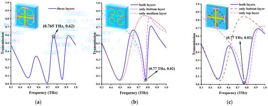 Figure 3a shows the results of the transmission calculation under normal incidence. At this time, the three-layer device is divided into two functional modules: firstly, the devices that can produce an EIT-like effect at 0.765 THz and are formed by the interaction between the cross on the top cross layer and the SRR on the second layer and, secondly, a single-frequency filter formed by an I-type cross of the third layer at 0.46 THz, as shown in Figure 3b,c. At 0.765 THz, the transmittance can reach 0.62, while the transmittance at 0.46 THz is as low as 0.07. Figure 3b,c provides the proof that the EIT-like effect is mainly caused by the coupling of the top cross layer and the SRR layer. The EIT results are from a coherent cancellation between two different paths in a three-level atomic system. Through the EIT phenomenon, the transmission phenomenon can be generated in the same frequency of the initially non-transmitted structure.