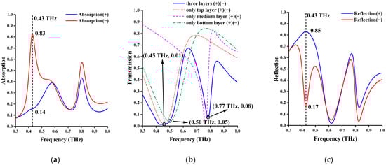 In our design, when the temperature of the device is above 67 °C (340 K), both VO2 (undoped and doped) phases become metallic. As shown in Figure 4, changes in geometric parameters of the cross layer and the I-type cross layer due to VO2 metallization and incident terahertz waves can be coupled to the metamaterial structures of the first and third layers at 0.45 THz and 0.50 THz, respectively, while the second layer still maintains a resonance frequency of 0.77 THz. When the cross of the first layer interacts with the I-type cross of the third layer, an asymmetric absorption effect is generated at 0.43 THz, with a lower absorption rate (0.14) from the cross side (normal incidence) and an absorption rate of 0.82 from the I-type cross side (reverse direction). This phenomenon of asymmetric absorption has a certain application prospect in electromagnetic isolation and stealth. Meanwhile, at 0.765 THz, due to the resonance reflection effect of SRR, the transmittance of both incidence directions is suppressed below 0.08, and the reflectance reaches 0.64 in normal incidence and 0.55 in the reverse incident direction. Other energy, which is induced by residual coupling (not fully decoupled) between SRR and the primary metal structure of the first and third layers, is absorbed. If complete decoupling can be achieved, then the perfect resonance reflection can be achieved at this frequency point, while the proposed structure temporarily cannot achieve complete decoupling.