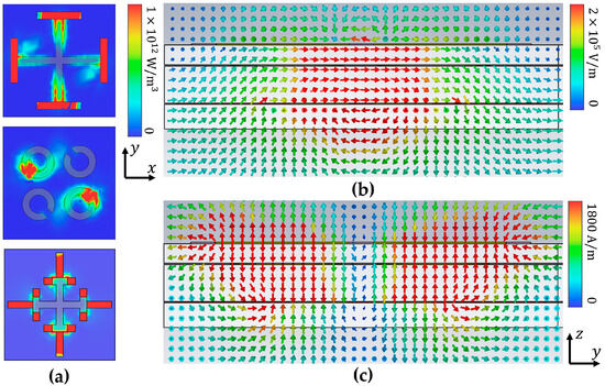 To better understand the phenomena and physical mechanisms that produce EIA phenomena at room temperature, the energy loss distribution of the proposed structure is analyzed, and the corresponding energy loss distribution when the incident wave in the x polarization direction is shown in Figure 5a. The electric and magnetic fields in the longitudinal section of the device are shown in Figure 5b,c. The EIA effect generated by this structure is mainly due to the vertical coupling between the three resonators. Due to the EIA effect, at 0.77 THz, most of the energy is lost through the SRR and the I-type cross, and a small part of the energy is lost through the cross-layer. The cross will generate strong loss points at the upper and lower two endpoints; the mechanism of the I-type cross is similar to the cross. The energy gathered in the metal will be lost in the VO2 and on the surface of the PI film due to the characteristics of the magnetic loss material without phase transition. The SRR ring shows a diagonal activation state due to the x polarization incident, and the energy is mainly lost at the gap between the SRRs and the PI dielectric material of the first and second layers.