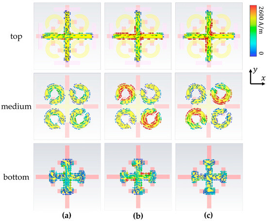 When the temperature rises into the range of 42 °C (315 K) to 67 °C (340 K), the bottom VO2 undergoes a phase change, and an EIT-like phenomenon occurs between the first and second layers. In order to better understand the physical properties of this EIT behavior, the surface current distribution in Figure 6 is calculated at the frequencies of two transmission troughs and one transmission peak, when the polarization direction of the incident wave is x polarization. Since the operating frequency of the bottom layer is moved to 0.43 THz under the phase-change action of doped VO2, the interaction of the three-layer structure at 0.77 THz becomes only a strong interaction between the first and second layers. Under the action of the external incident polarized wave, the bar parallel to the incident electric field is excited. Due to the interaction between the first and second layers, strong coupled resonance is excited on the second and fourth quadrant SRRs of the second layer (which cannot be directly strongly excited by the external × polarization incidence). As a result of the strong interaction between the first layer bar and the second SRR, electromagnetic-induced transmission occurs. Although the first and second layers also interact at frequencies of 0.70 THz and 0.855 THz, the current of the second-layer SRR induced by it is either very weak (such as 0.70 THz) or has a phase difference with the surface current of the first layer (opposite direction, @ 0.855 THz); thus, EIT cannot be achieved in these places. From the observed electric field distributions on the surfaces, it can be determined that the strong interaction between the cross of the first layer and the gold SRR of the second layer is the main reason for the electromagnetically induced transparency.