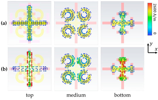 When the temperature rises to above 67 °C (340 K), both doped VO2 and undoped VO2 become metallic. At this time, asymmetric absorption can be observed at 0.43 THz. The absorption is weak at forward incidence and very strong at reverse incidence. The absorption is mainly formed by the coupling of the first layer of the cross and the bottom layer of the I-shaped crosses with their VO2-extended structures. The operating frequency of the second layer of the SRR ring is fixed at 0.77 THz, so it has no effect on the absorption of this frequency. As shown in Figure 7a, at forward incidence, the current of the three-layer structure is small and has little effect on the incident wave. In Figure 7b, the strong absorption at reverse incidence is caused by the antiparallel current between the top cross and the bottom VO2 film. This current loop generates an artificial magnetic dipole moment which will interact strongly with the incident magnetic field and contribute to the absorption.