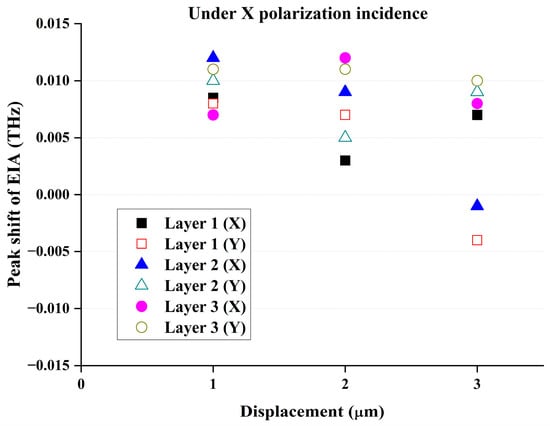 From the simulation results in Figure 9, it can be concluded that if the misplacement between the metasurface structure layers is within 3 μm, the spectrum of the devices will mostly have a slight blue shift, and a minor red shift may occur when the first layer shifts towards the y direction and the second layer shifts in the x direction. Because the precision of the photolithography-related technology is much better than that of 3 μm, the fabrication of the proposed device is realizable, although the process complexity may be relatively high.