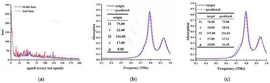 Here, we use the EIA state of three-layer coupling as an example to illustrate how to inverse design a more complex multi-function metamaterial device. The data set collected from the previous simulation was entered into the model for training. After 2000 iterations, when the test loss of the test set drops to 4.7, the training process converges, and the loss becomes stable. The loss curve of the test set is shown in Figure 11a. Once the inverse learning model is trained, we can predict the desired structural parameters through the generator in a few milliseconds.