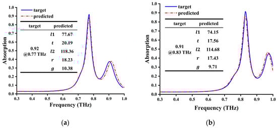 To achieve better EIA effect, we manually generated a spectrum with ideal absorption at two target frequencies (0.77 THz and 0.83 THz) and input them into the DNN model for inverse design and prediction of parameters. Then, we used CST software to simulate and verify it again. The obtained simulation results with the prediction of parameters are shown in Figure 12a,b with the ideal spectrum. The analysis shows that after using the DNN model for inverse design, the three-layer structure can be designed and optimized quickly and accurately. Due to the imperfection of the current model, the result may not be the optimal state of the structure. We can manually fine-tune the model parameters to achieve the best state based on the model parameters generated by the DNN model. By using inverse learning, the design time of complex devices can be greatly shortened to about 1/1000 to 1/10,000 of the original time.