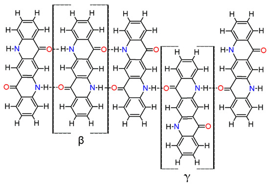 Quinacridones form fine crystalline solids based on self-assembly via intermolecular hydrogen bonding (Figure 1) [11,12]. In the isolated molecules, the electrons of the rings are weakly conjugated via the C=O and N-H groups. In the solid state, hydrogen bonds are formed, weakening the C=O and N-H bonds and strengthening the conjugation in the aromatic rings [13]. Quinacridone layers adhere strongly to surfaces. The difference in the maximum desorption temperatures of multilayers of quinacridone (510 K) and pentacene (400 K) underlines the importance of intermolecular hydrogen bonds [14].