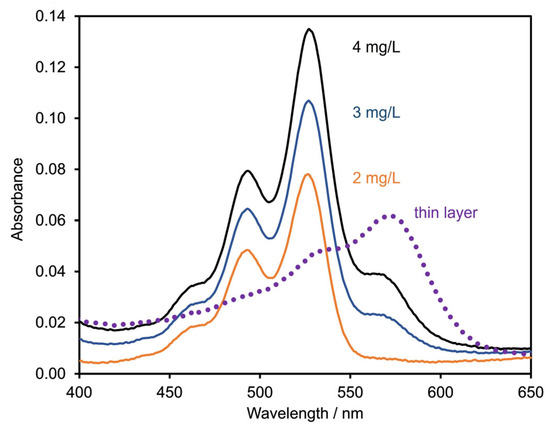 The acquisition of electronic absorption spectra of DQA is similarly challenging due to the low solubility. Dilute solutions (concentration below approx. 6 μmol/L) in DMF feature the expected fine-structured absorption band with a maximum at 527 nm (Figure 2). The shoulder at 565 nm, which intensifies with increasing concentration, is an indication of the pronounced tendency towards the formation of molecular aggregates [81]. In order to determine the electronic absorption properties of the gliding layer, a thin layer of DQA was deposited onto a glass substrate and measured in transmission. Supramolecular structures held together by hydrogen bonds are most likely responsible for the observed red shift. The absorption maximum of the thin layer corresponds well with the absorption band of the molecular aggregates in the solution.